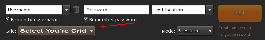 - Once you have created the avatar account in the page https://register.gentlefiregrid.net, enter your fist and last name in the field, your password and part of "Grid" select "gentlefire".
